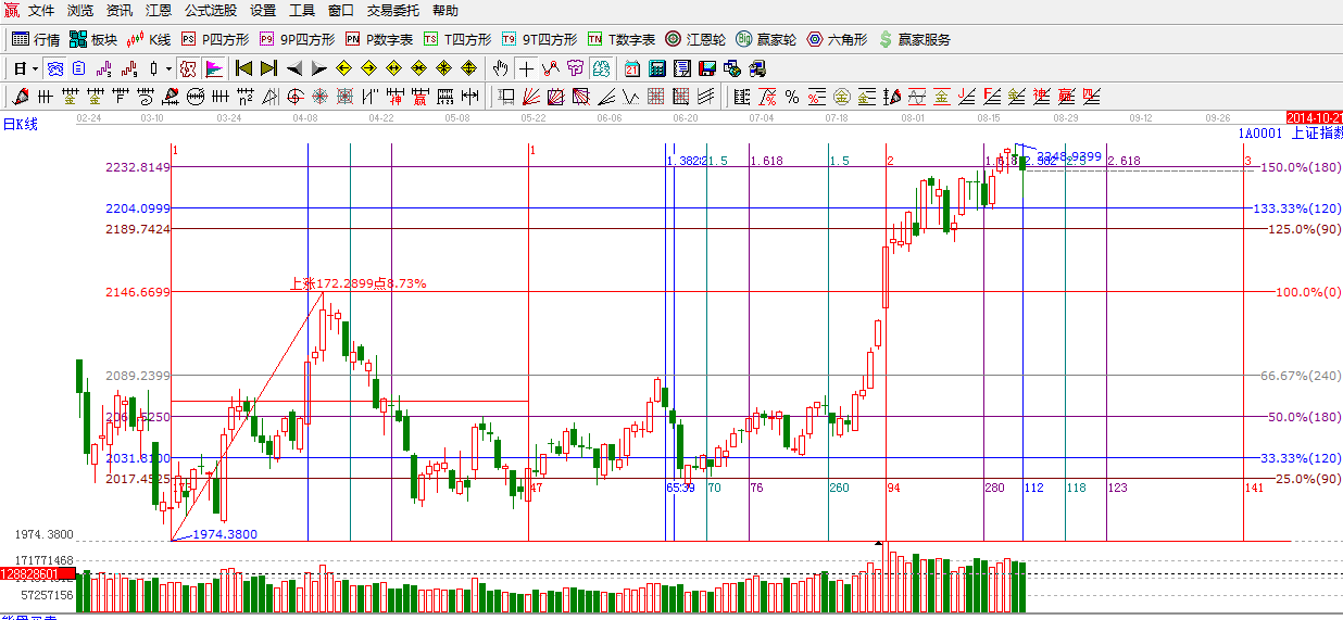 ★依據贏家江恩系統波段百分比提示:破位180度支撐線2232點,回踩江恩120度位置附近,震蕩回升, 120度支撐是2204點,今日注意180度2232的爭奪。