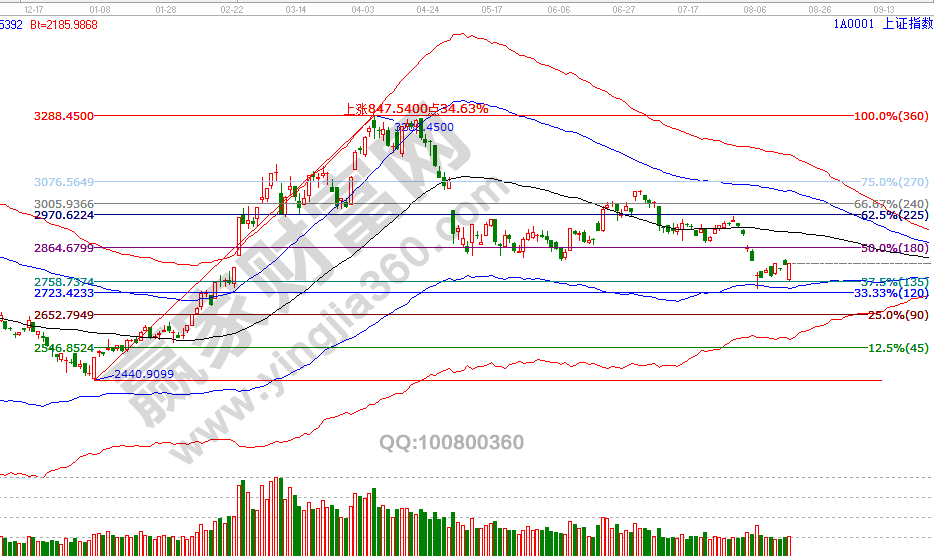 先回顧下近期預判,6號指數觸及日線極反通道藍色下軌線2744點定性反抽開始,并測算時間指向16號,空間指向百分比延伸180度2834點(14號最高點2829點)。16號是8月日線級別時間窗口,趨勢方面明天指數將確認一重要關鍵線,影響著下一個時間周期的走勢。13、14號分析中談到的一次價格快速波動期是連續的,按歷史規律15分鐘再度失守生命線指數將直逼6號低點。激進者剩余最后一批倉以百分比延伸線120度2791點得失做決策。8月16號盤中壓力是225度2815點、270度2829點,盤中支撐是135度2786點、90度2772點。操作策略,指數生命線下弱勢區運行,激進者3成倉以內交易,穩健者空倉休息。