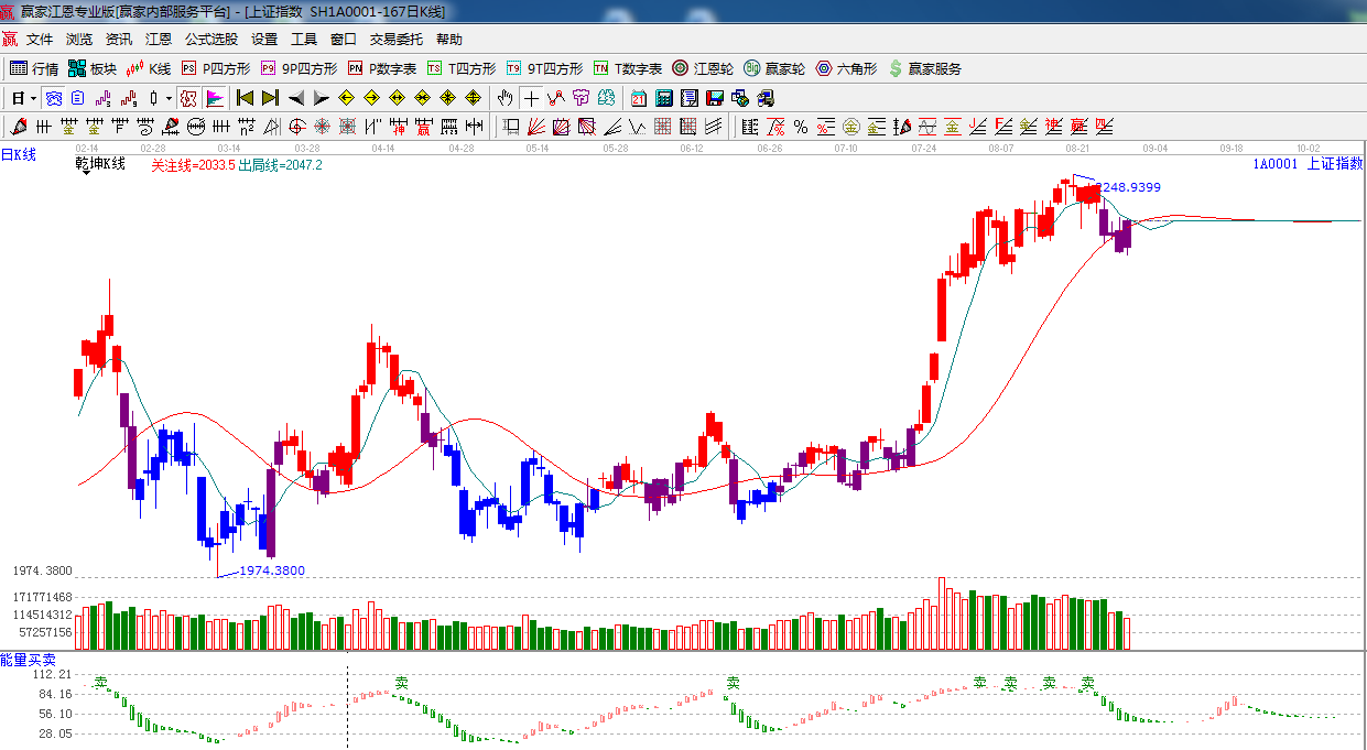 ☆依據贏家江恩系統乾坤K線提示:紫色十字星,紫色k線代表警示,破位反抽關注線,短期謹慎看多。