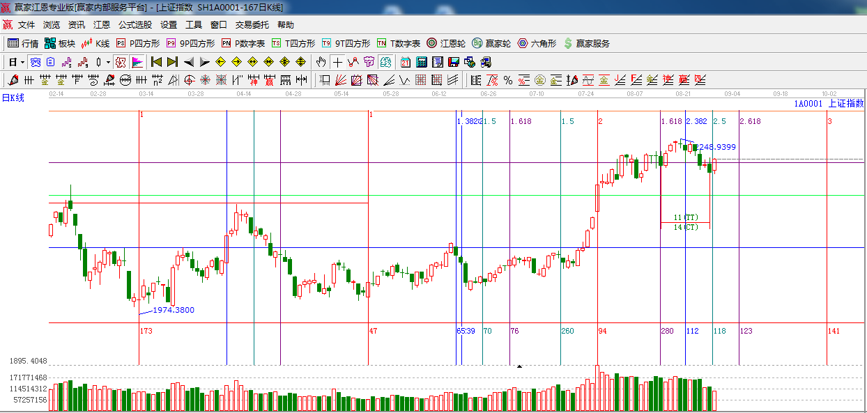 江恩看盤綜述:依據贏家江恩技術工具分析得出:指數震蕩反抽,極反通道藍色外軌線,成交量漸趨萎縮,外軌線是2221點,此位置不能放量收復,市場短期將仍以震蕩反復為主。操作,謹慎為主,做好高拋低吸。