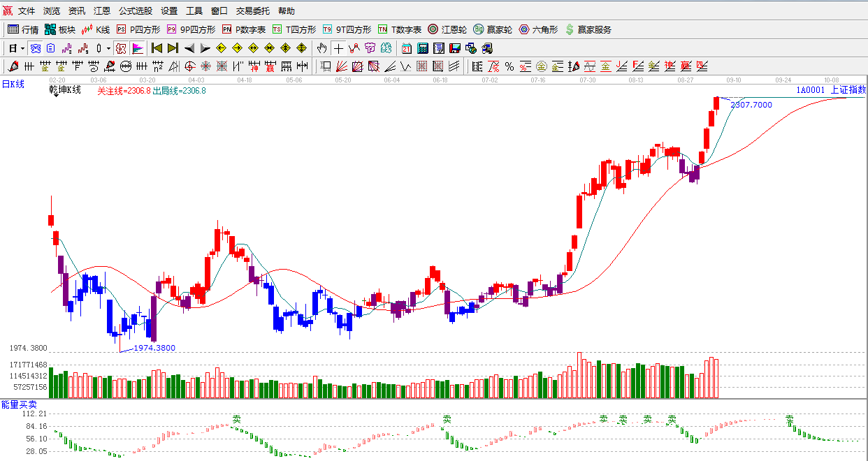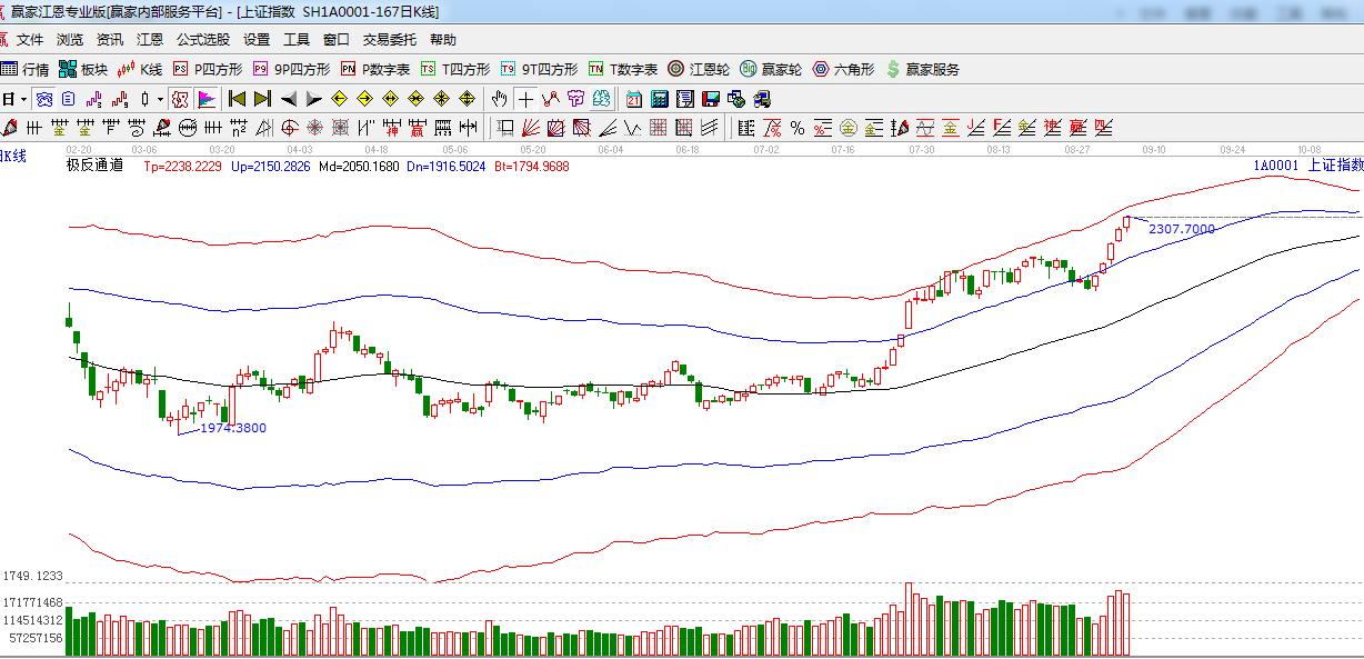 江恩看盤綜述:依據(jù)贏家江恩技術(shù)工具分析得出:兩市再創(chuàng)新高,一舉突破2300點關(guān)口,成交量繼續(xù)放大,由于上方接近極反通道外軌線,預(yù)計短期震蕩上行更可能成為后市主基調(diào)。阻力區(qū)間2300-2318附近,今日是9.5日時間之窗。