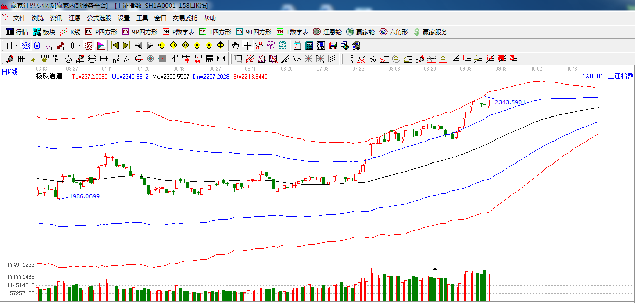 極反通道提示:外軌線之下高位震蕩,短期將有之前強勢上行轉為震蕩盤升,謹慎看多。