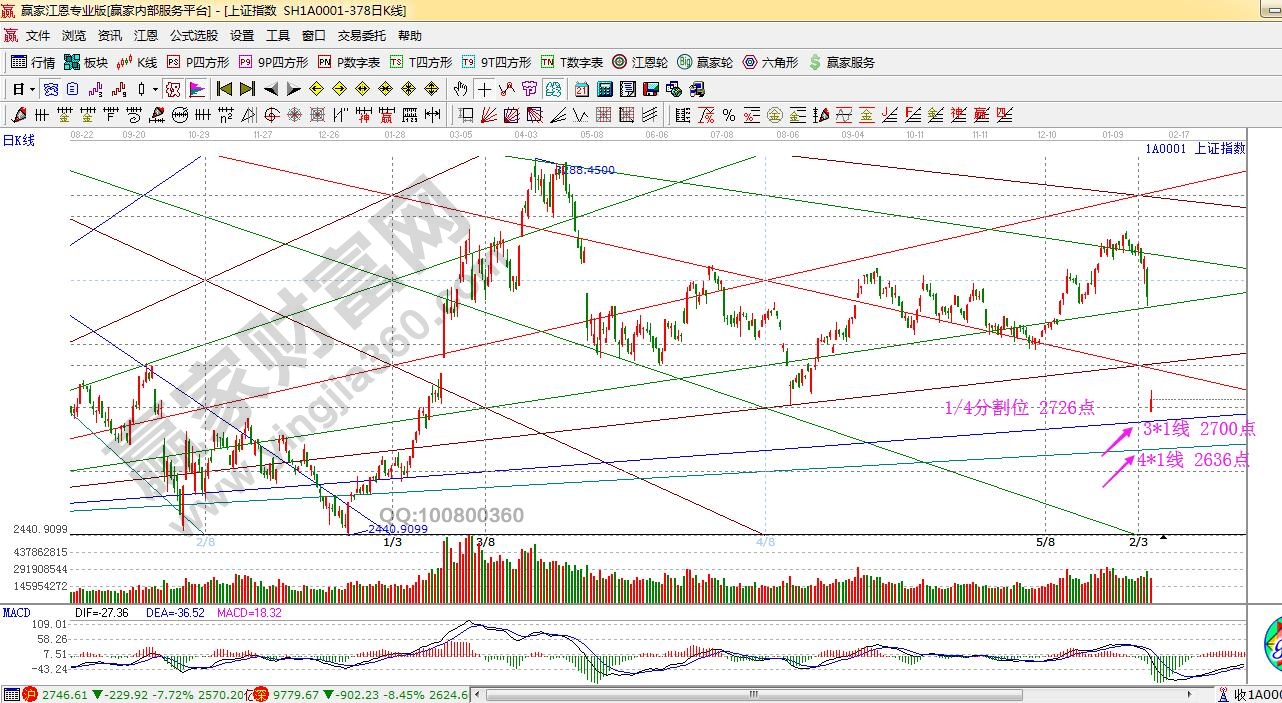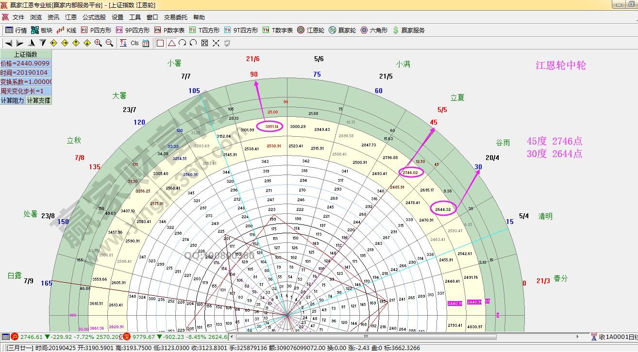 江恩看盤綜述:通過贏家江恩理論系統趨勢、時間、價格工具綜合評判市場一星看多(五星評級標準)。2020年春節后第一個交易日,上證低開8.42%,創近23年記錄!回顧江恩時間分析,1月13日時間點如期見本輪高點及1月20日時間點見次高點后,指數一路下行至今。節前大跌失守生命線,當前低開失守藍線,按照規則,下方紅色外軌線就在眼前,對應支撐2676點!縱觀A股近30年歷史,只有5次擊穿紅色下軌線,隨后市場在紅色外軌線止跌或成為階段底部,其中不乏止跌后快速反彈,或進入震蕩筑底階段.那么,對應當下持續殺跌至紅色外軌線附近,要做的是跟隨市場的時價信號,等待并捕捉新的階段性入場信號。4號盤中阻力2757、2772點,支撐2692、2644點。操作策略,指數生命線下弱勢區運行,倉位3成以內,穩健者空倉休息。2月4日是立春節氣,也是庚子鼠年的起點,新一輪的循環也即將開啟,不要遠離市場!