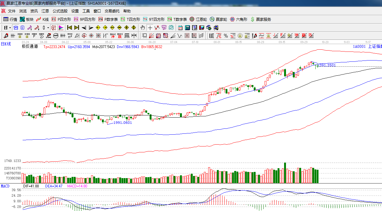 極反通道提示:在藍色外軌線之下,收陰十字星,短期謹慎為主。