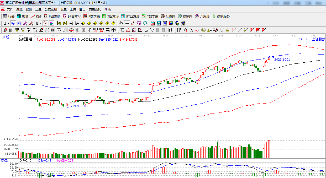 ★依據贏家江恩系統極反通道提示:指數繼續放量上行,突破藍色外軌2410點,留意后期量能,如不能支持,此位置將仍有反復。