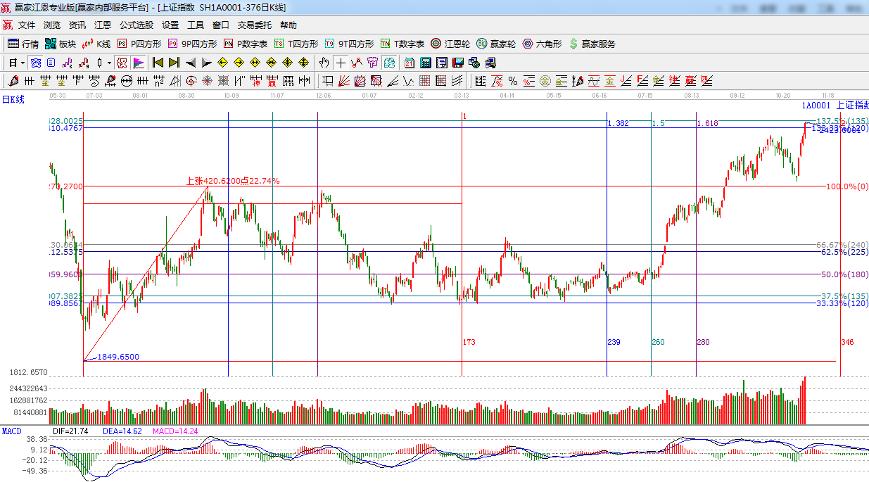 ☆依據贏家江恩系統黃金時間周期線提示:下一重要時間窗口是11月24日附近。