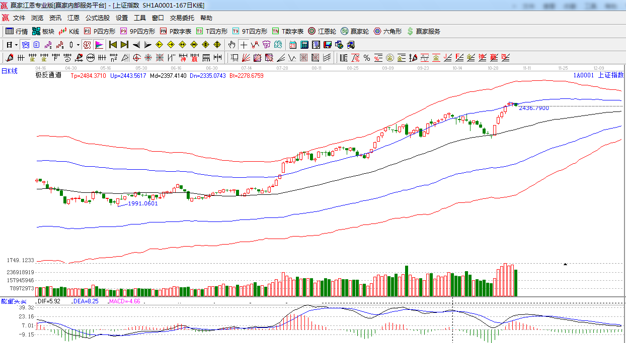 極反通道提示:今日收盤破位藍色外軌線,短期注意風險。
