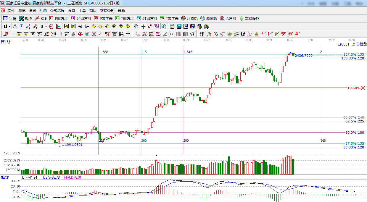 江恩看盤綜述:依據贏家江恩技術工具分析得出:上證指數依舊呈現窄幅震蕩走勢,以小陰線報收,市場顯然存在調整需求,下方量能依然保持強勢,短線回踩下方支撐120度2410點,前高2391點,空間并不大,所以市場可能采取以時間換空間的方式來消化短線獲利盤以及對指標的修復是大概率事件。