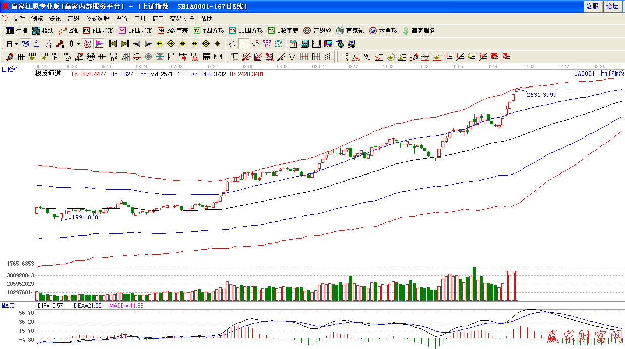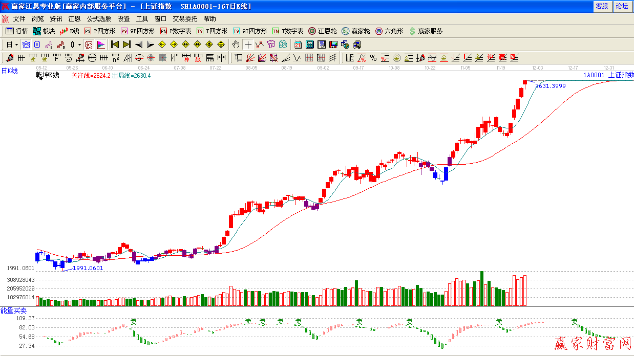 周四,滬深兩市繼續保持逼空上行態勢,創出年內新高,到達極反通道紅色外軌阻力線,上證大漲26.14點,以 2630.49點報收,同時,兩市成交量合計達6184.8億元,再創天量。