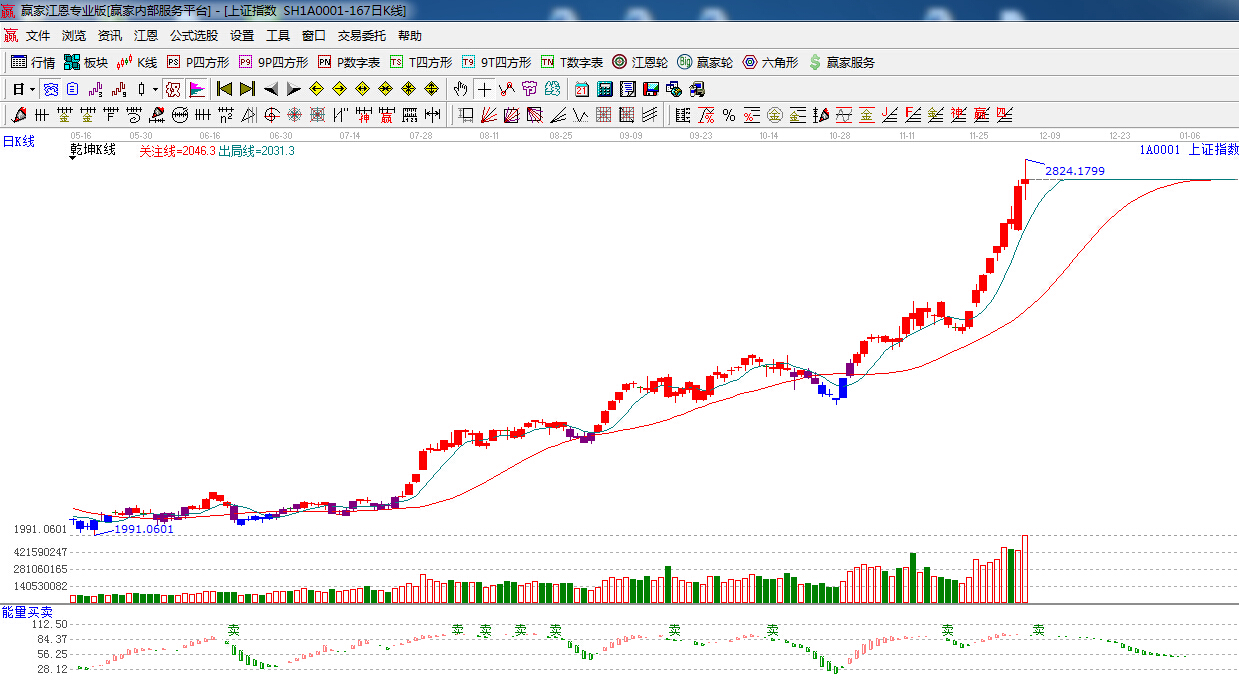 ★依據贏家江恩系統極反通道提示:超強外軌線之外,強勢震蕩,十字星報收,適當控制倉位,注意短線回調風險。