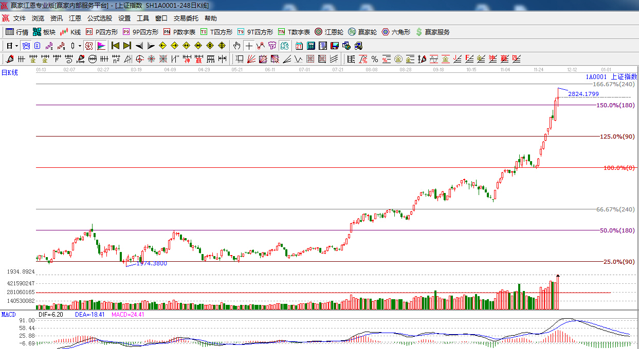 江恩看盤綜述:依據贏家江恩技術工具分析得出:,大盤昨日一度沖擊江恩240度線附近,終盤十字星報收,成交量再度創出歷史新高,權重和題材形成鮮明反差,預計短期高位震蕩。下方支撐關注180度2743點。