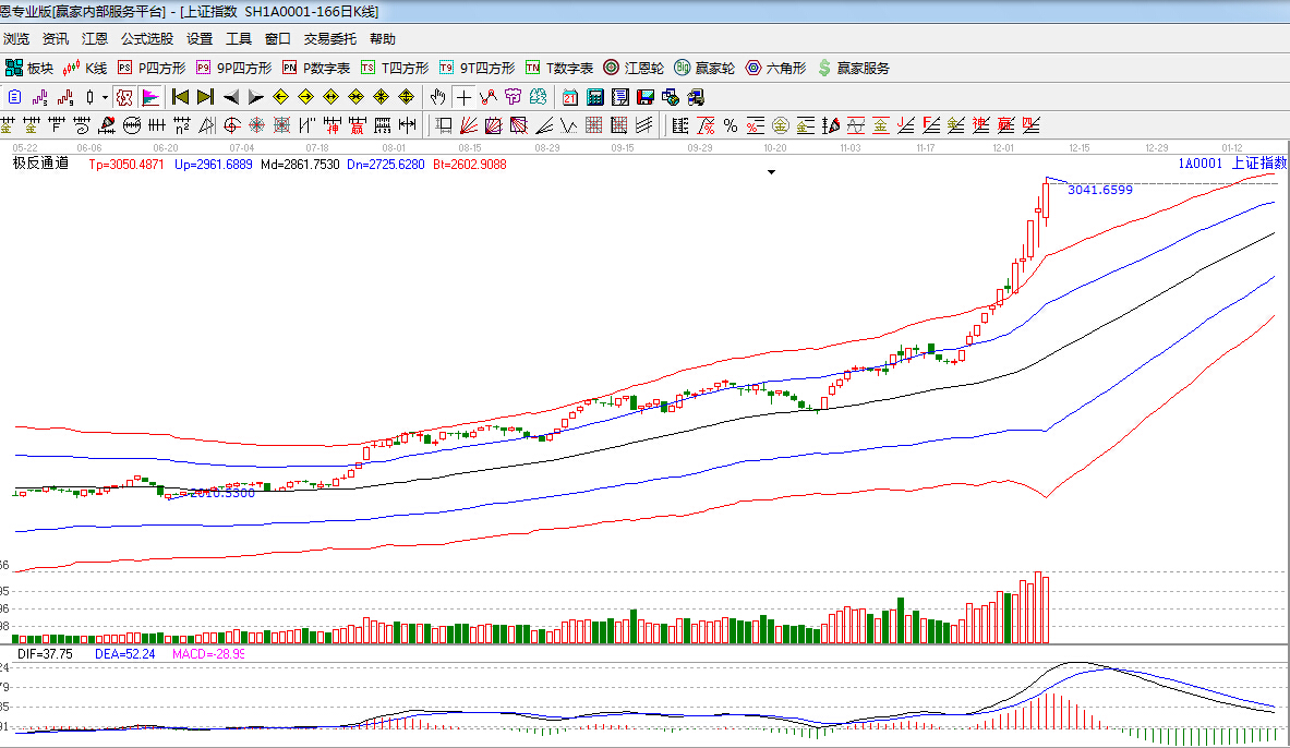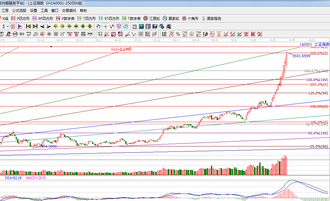 江恩看盤綜述:依據贏家江恩技術工具分析得出:指數繼續放量拉升,最高3041點,收盤3020點,量能保持強勢,對于指數而言,短線不排除還有可能震蕩創新高,但上方將面臨強阻力區間3038點—3111點,所以后半周短線震蕩或加劇,操作上,適當拋售漲幅過大的品種,重視低估藍籌股的補漲機會,例如受政策刺激的軍工、高鐵、金融等板塊。