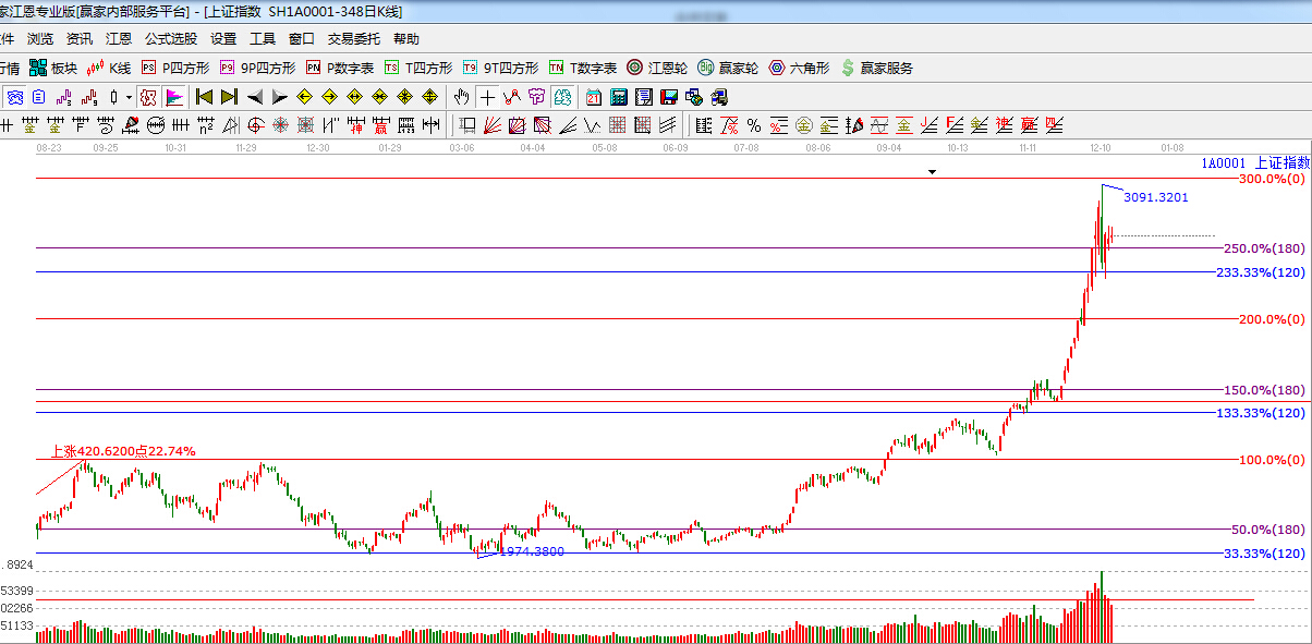 ★依據贏家江恩系統波段百分比提示:當前支撐是180度,2900點,江恩120度支撐2831點,上方強阻力依然是0度位置3041點—3111點。