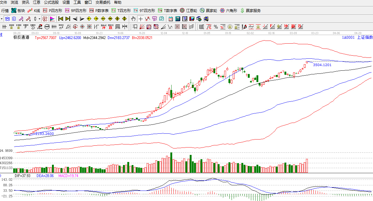 極反通道提示:滬指強勢突破09年的3478點高位,向下一下一目標位藍色外軌線駛去,極反通道藍色外軌線3551點附近