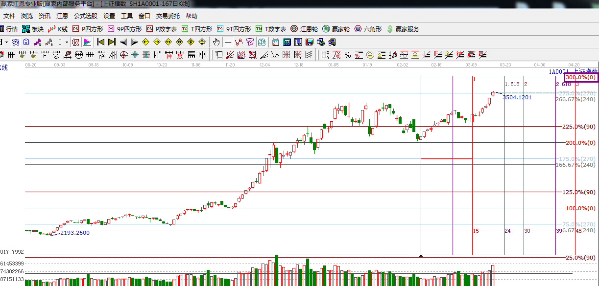 江恩理論系統黃金時間周期線提示:16日時間窗口,滬指如期沖關,短期下一時間窗口是 3月23日,3月30日。