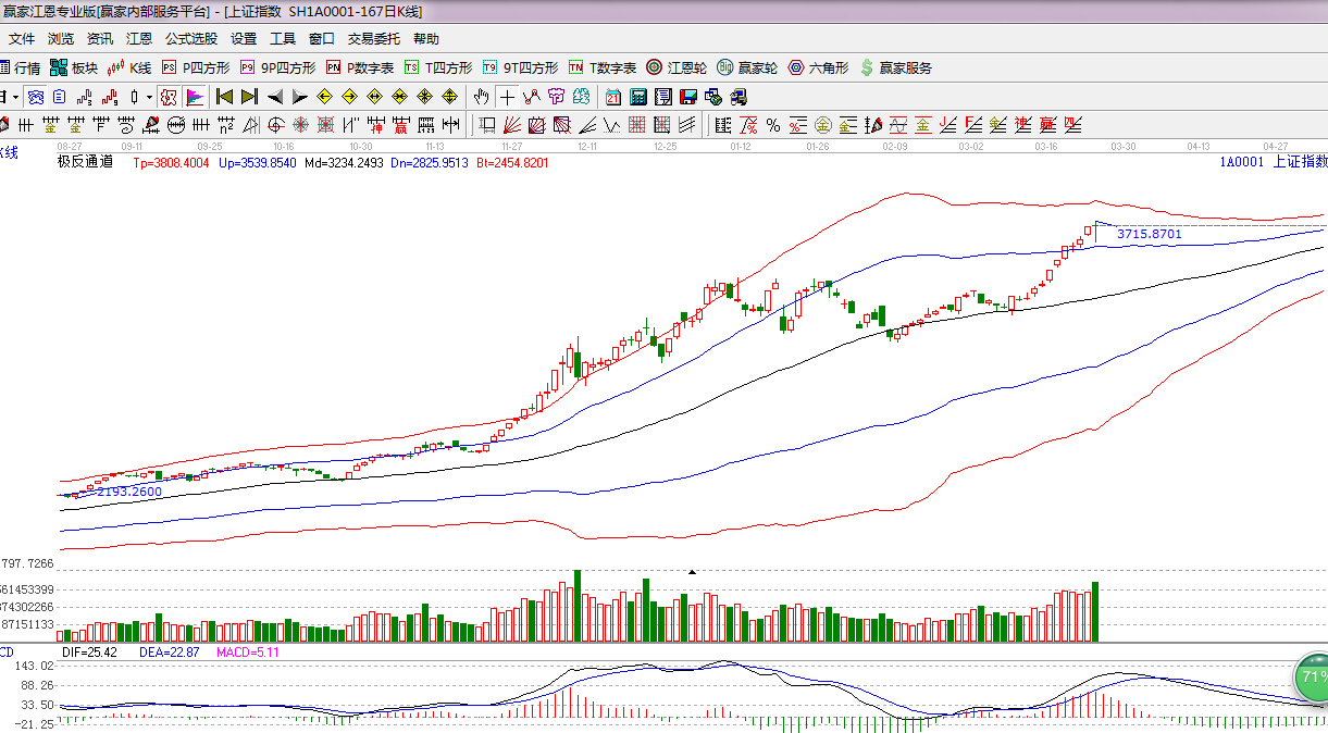 江恩看盤綜述:依據贏家江恩技術工具分析得出:今日早盤股指窄幅震蕩盤中跳水60點,回踩江恩極反通道藍色外軌線,隨后震蕩反彈并翻紅,終盤放量十字星報收,市場有其自身的運行規律,罕見9連陽之后,短線震蕩調整不可避免,滬指的巨震,主力資金暴力洗盤的概率很大,但今日放量收星對于后期也需留一份謹慎,下一時間窗是3月30日。操作上,逢低關注國資改革、年報超預期個股,對于短線急漲的個股要控制好倉位。