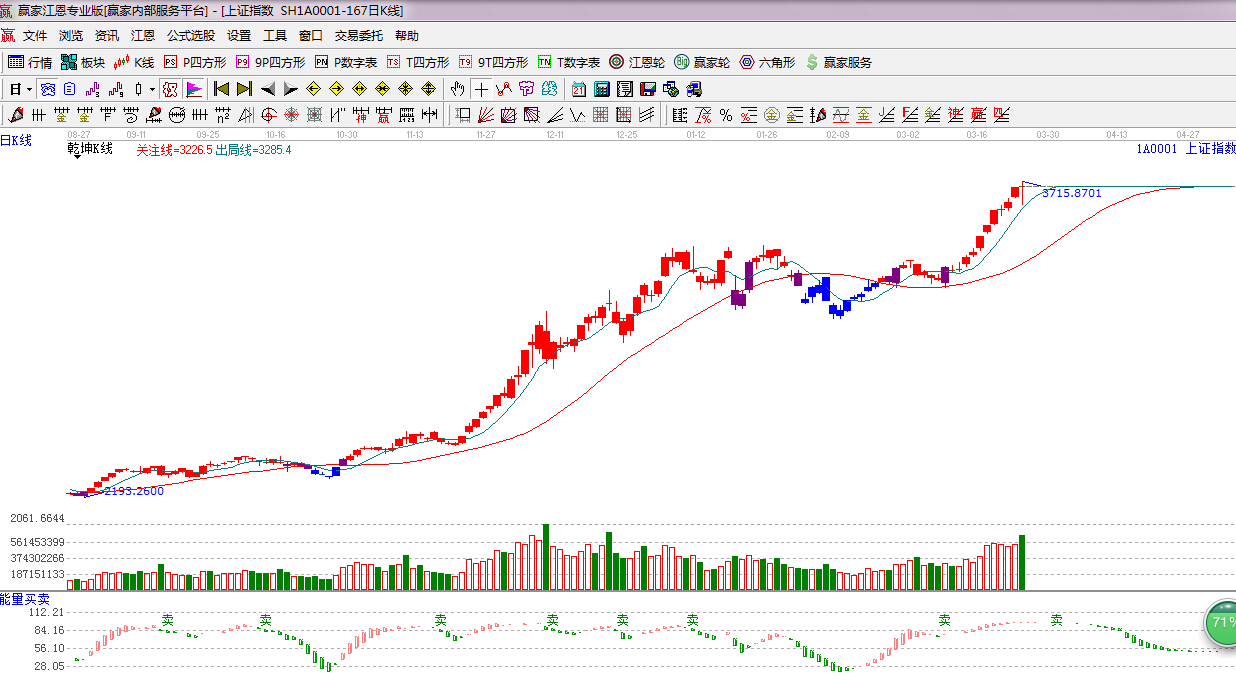 ☆依據贏家江恩理論系統能量買賣提示:紅色能量柱看多,但與前期呈現小幅背離走勢,謹慎看多。