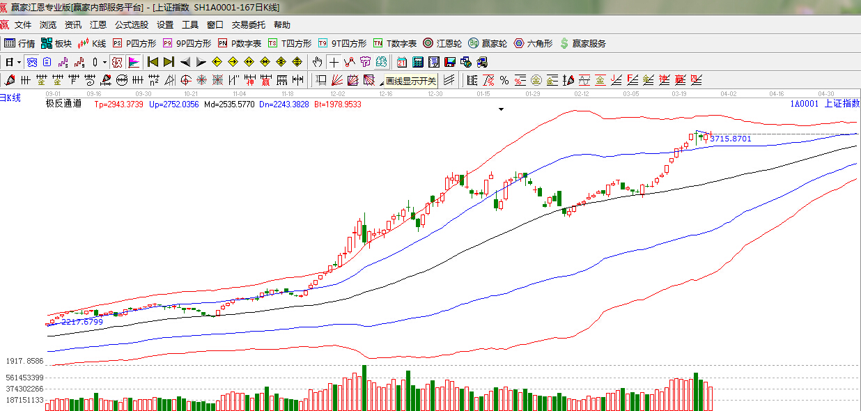 江恩看盤綜述:依據贏家江恩技術工具分析得出:滬指繼續圍繞極反通道藍色外軌線上,3700點之下區間震蕩,創業板指一度回落,午后回升,說明創業板不會就此大幅調整,但市場短期的分化將是必然的,依據工具分析,極反通道藍色外軌線不破,滬指震蕩后仍有在此上漲的基礎,操作上,券商,煤炭、有色、電力、化工仍可逢低關注;而國企改革、一帶一路等仍是中期關注焦點。此外,軍工、傳媒等題財股或反復活躍,也可波段關注。