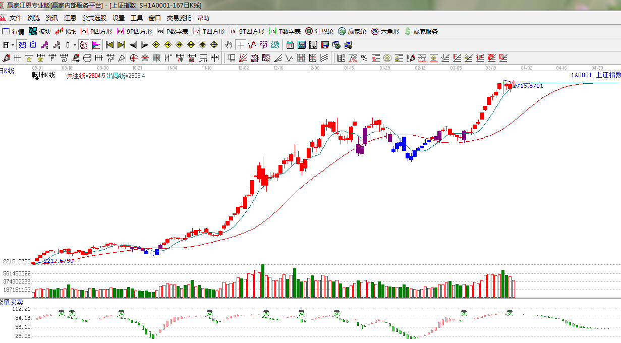 ★依據贏家江恩理論系統乾坤K線提示:紅色k線,關注綠色關注線的得失。