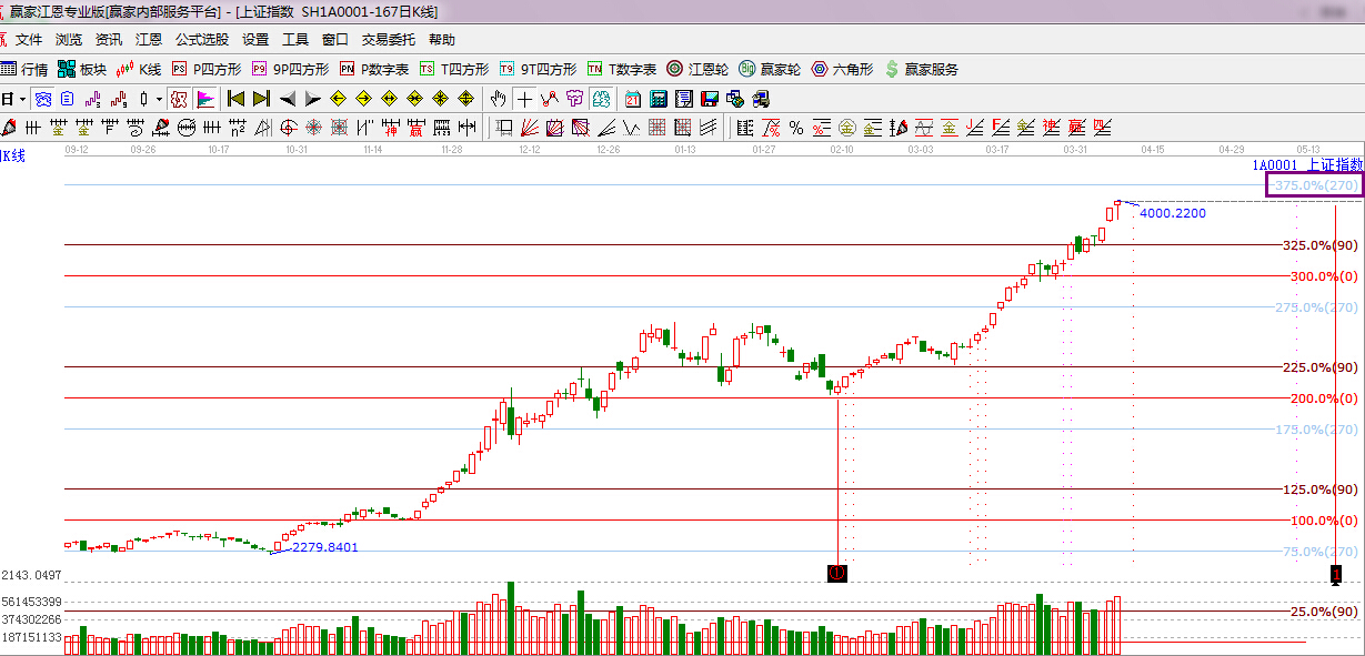 ★依據贏家江恩理論系統波段百分比提示:依據規則下一目標位是江恩270度4081點。