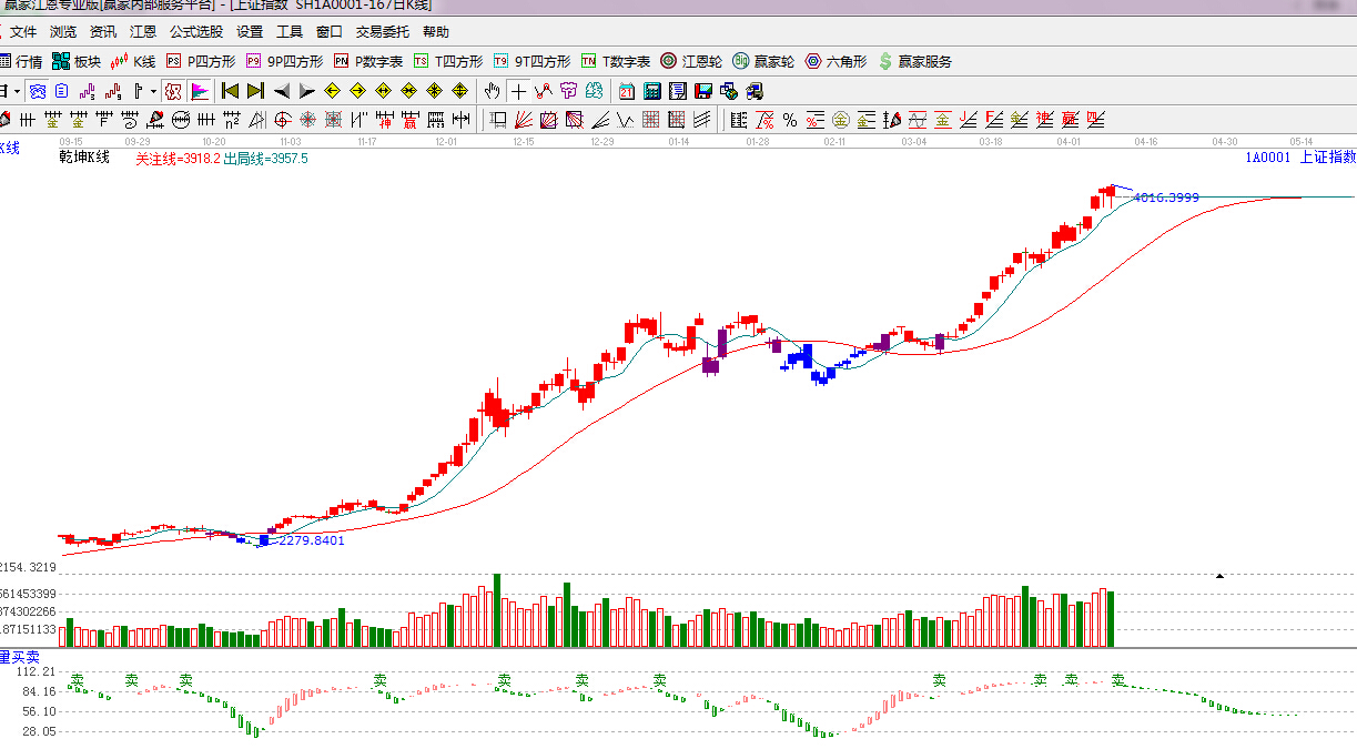 ★依據贏家江恩理論系統乾坤K線提示:紅色k線,綠色線上方,留意綠色短線出局線,綠色線不破,繼續看多。