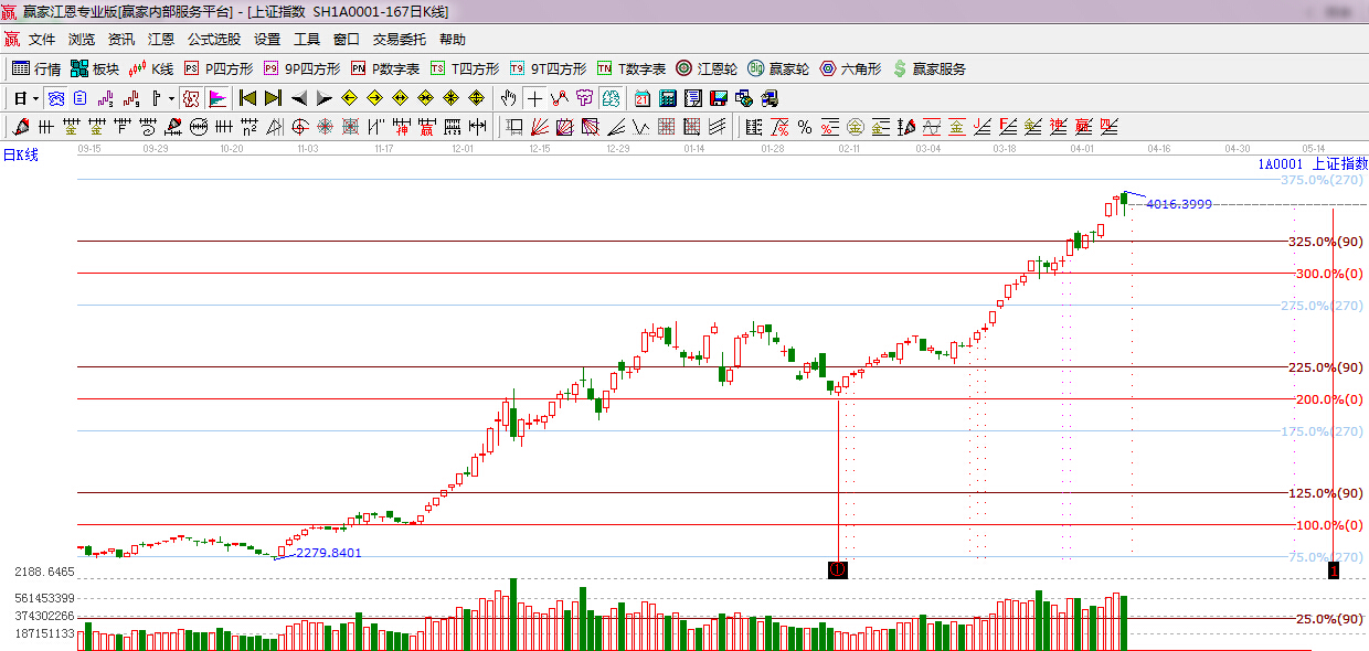 ★依據贏家江恩理論系統波段百分比提示:依據規則下一目標位是江恩270度4081點,下方支撐江恩90度是3783點。