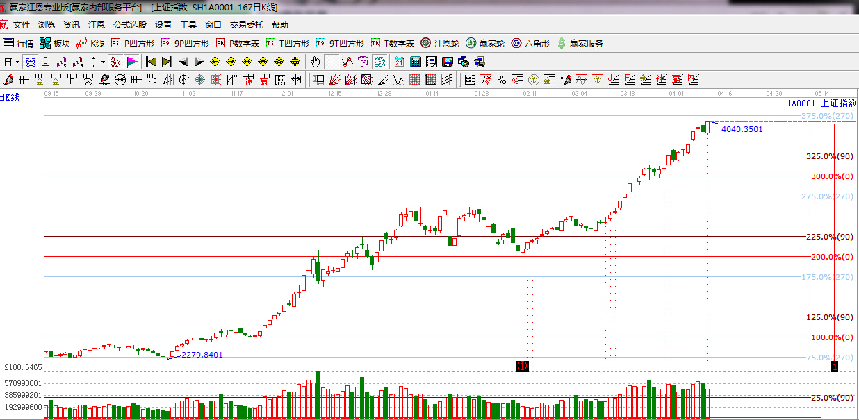 ★依據(jù)贏家江恩理論系統(tǒng)波段百分比提示:依據(jù)規(guī)則下一目標(biāo)位是江恩270度4081點(diǎn),下方支撐江恩90度是3783點(diǎn)。