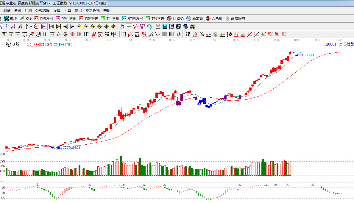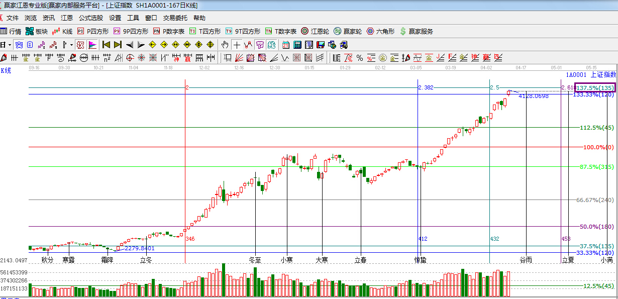 江恩看盤綜述:依據贏家江恩技術工具分析得出:今日滬深兩市跳空突破江恩120度4082點,隨后一路震蕩走高,并成功站上4100點,下一目標位是135度4157點,短期市場指數連續逼空后出現兩次缺口,加之本周大批新股發行的干預下,將對指數形成一定壓制,短期風險與機會并存,盤中操作可適當高拋低吸來做差價。但整體趨勢性機會不變,市場下一時間窗口4月20日(谷雨)。操作上,大金融以及大基建板塊為核心,另外,軍工、傳媒等題財股或反復活躍,可波段關注。