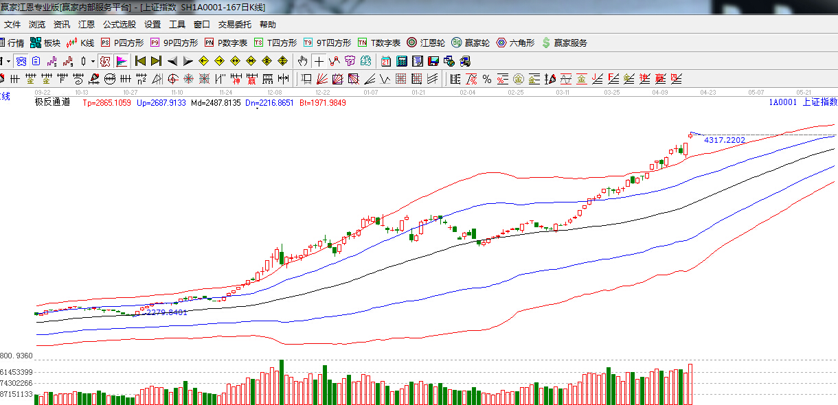 極反通道提示:極反通道紅色外軌線支撐上方,延續強勢,短期繼續謹慎看多。