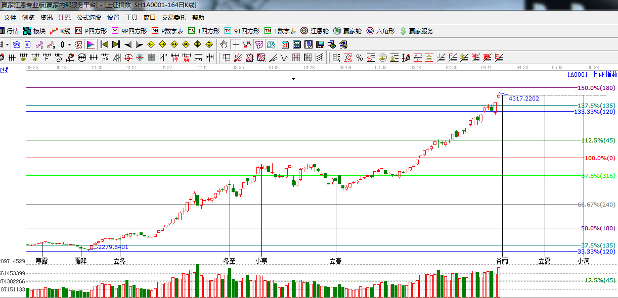 江恩看盤綜述:依據贏家江恩技術工具分析得出:周五滬指大漲超百點,午后一度沖上4300點,再創7年新高,尾盤小幅回落。創業板指表現疲弱,近日連續百點長陽,預示著大盤的瘋狂才剛剛開始,依據江恩百分比分析江恩120—135度(4082--4157)位置轉換為支撐,此位置不破將繼續看高,下一目標位是江恩180度4384點,225度4611點,近期時間窗口是谷雨4月20日。操作上,建議投資者利用盤中震蕩機會,逢低介入近期漲勢相對落后的國資改革、業績超預期個股。