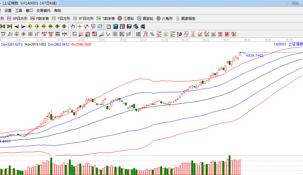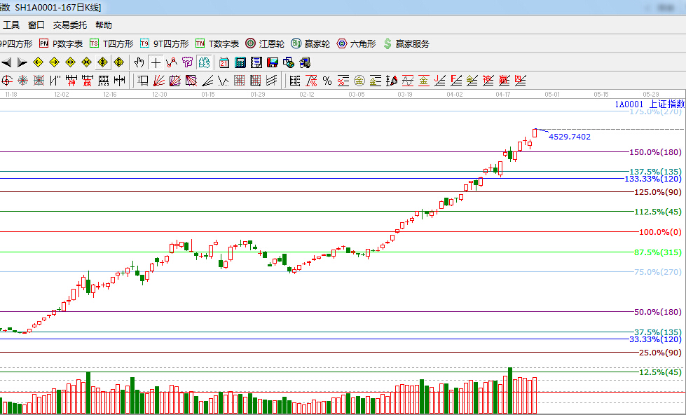 江恩看盤綜述:依據(jù)贏家江恩技術工具分析得出: 今日滬深兩市一路震蕩上行,整體來看,180度4300點支撐已被確認,指數(shù)穩(wěn)步攀升,今日滬指沖破4500點,依據(jù)規(guī)則,下一目標位是270度4702點附近,另外,本周逢“五一”假期,防止滬指短線沖高震蕩,中線整體向好趨勢不變,操作上,繼續(xù)布局滯漲品種,尤其是最近大幅跑輸指數(shù)的潛力品種,建議重點關注受益經(jīng)濟刺激計劃,但尚未大漲的環(huán)保、水利、光伏等板塊。