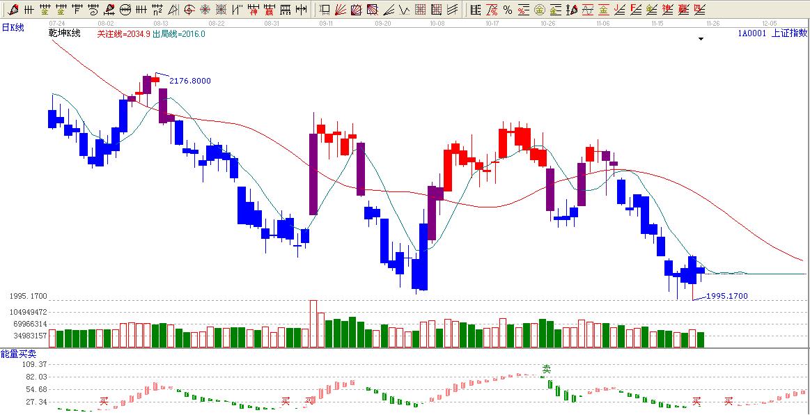 ☆依據(jù)贏家江恩系統(tǒng)乾坤k線提示:大盤還是處于藍色區(qū)域,看空信號。