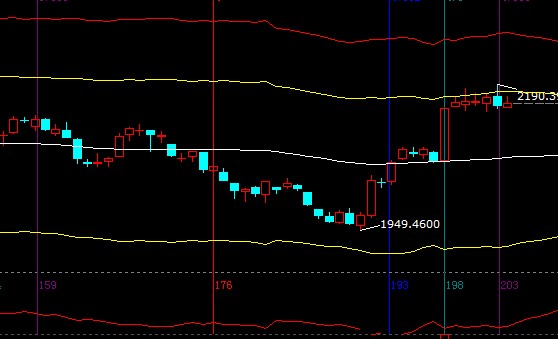 指數在極反通道外軌線下震蕩運行,近兩日收盤價低于江恩多空戰線短期線下,結合量能及長時間橫盤,市場短期轉向的信號越來越強; 30分鐘生命線是2158附近,此線不破未來產生的盤中反抽也是風險警示信號,投資者需要對手中所持個股提高止贏位保護收益,短周期生命線支撐2135-2140,外軌線阻力2168-2173;