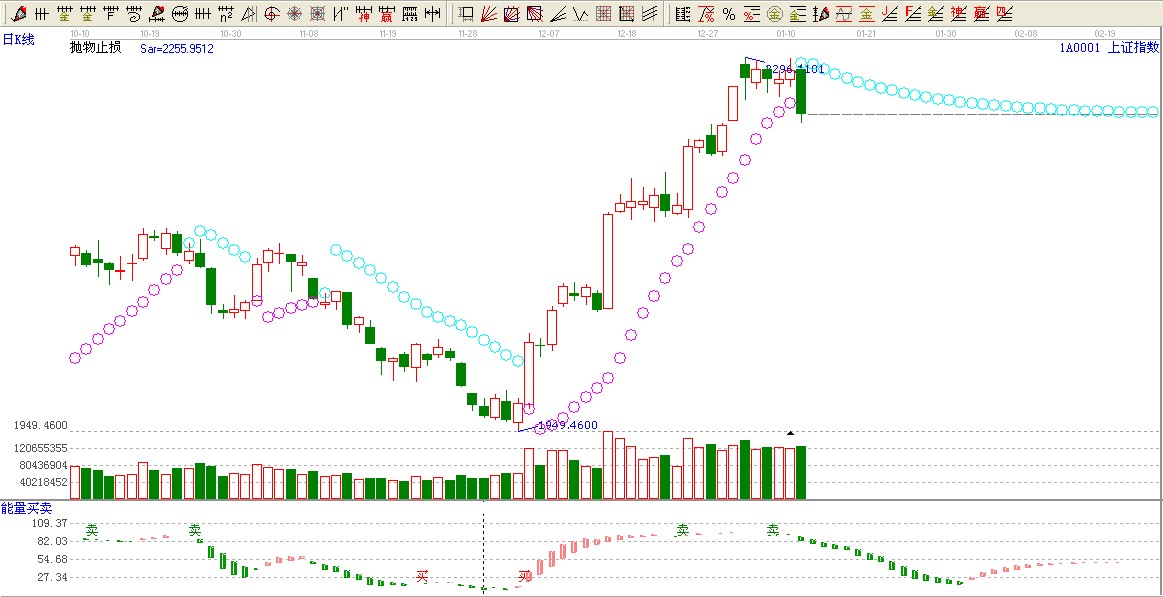☆依據贏家拋物止損提示:大盤拋物止損粉紅色變為綠色,看空。