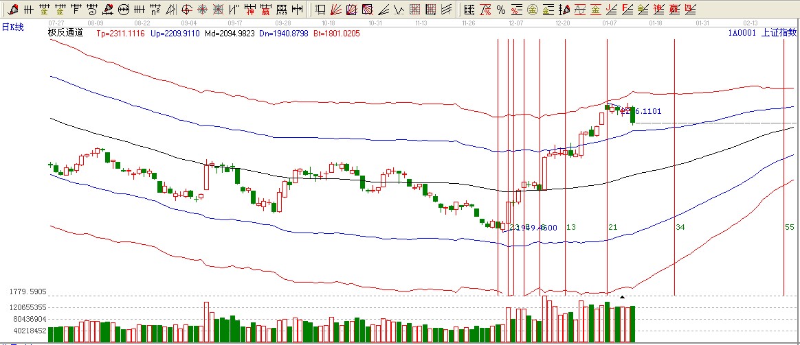綜上所述:大盤短期315度位置2270構成短期強壓力。下方極反通道藍色上軌2222附近構成強支撐。