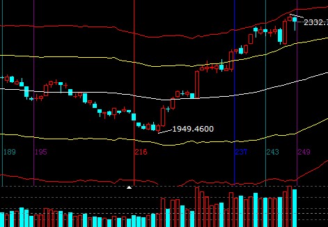 大盤日線紅色外軌線、60、30分鐘外軌線合力形成共振區,此區間謹慎做多,市場最終將回歸自身運行規律,依據規則失守一線看低一線,所持倉位應不斷提升止損位保護收益,短期支撐2285-2295,外軌線阻力2315-2325;
