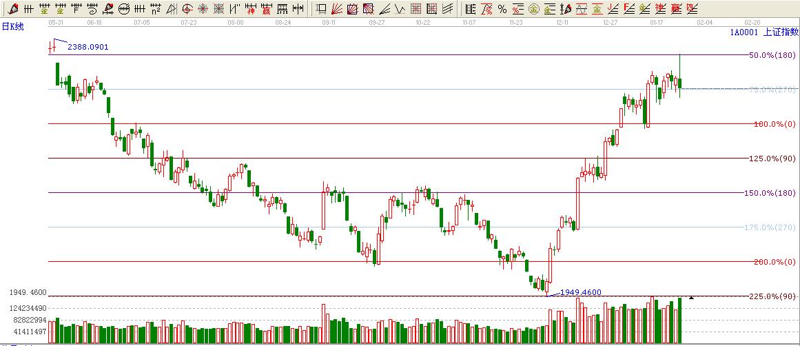 綜上所述:大盤最高上攻波段百分比延伸線180度2360位置上方,遇阻回落,在 270度位置獲得支撐,這里一旦破位就是0度位置2250附近了。