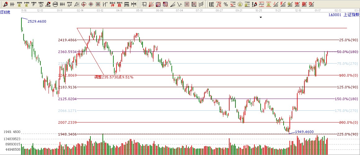 ★依據(jù)贏家波段百分比伸線提示:大盤收盤依然在180度2360壓力下方,,只要突破這里才會看高至90度位置2420附近。