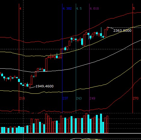 大盤運行在極反通道超強通道,短周期K線距離強勢外軌線較近盤中會在此區域受阻,整體做多觀點不變,通過提升止損位保護收益或倉位上做高拋低吸,短期支撐2335-2348,阻力2368-2374;