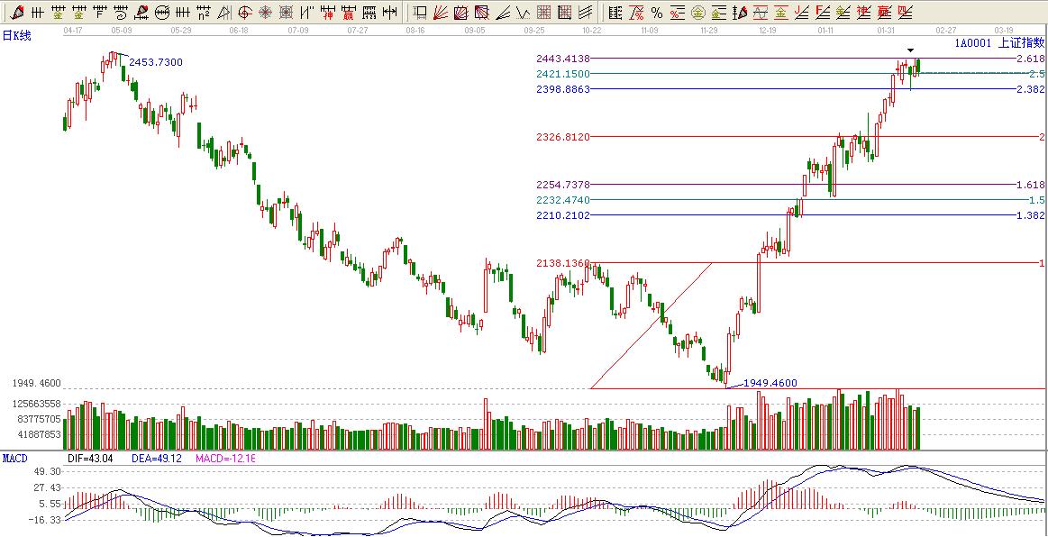 大盤如期圍繞黃金分割2.618-2.382位置震蕩,也再一次滲透了黃金分割在金融市場一個不可忽視的細(xì)節(jié)問題。盤面大盤高開后震蕩走低,個股較為活躍截止收盤大盤跌10.84點跌幅0.45%,漲停家數(shù)29家,跌幅5個點以上的15家。引人注目的就年前復(fù)盤的10家st股票4家漲停4家跌停,可謂是雷厲風(fēng)行。