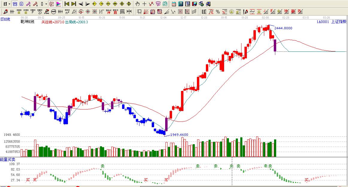 ☆依據贏家乾坤K線提示:大盤有紅色線轉換為紫色線,跌破關注線,看空。