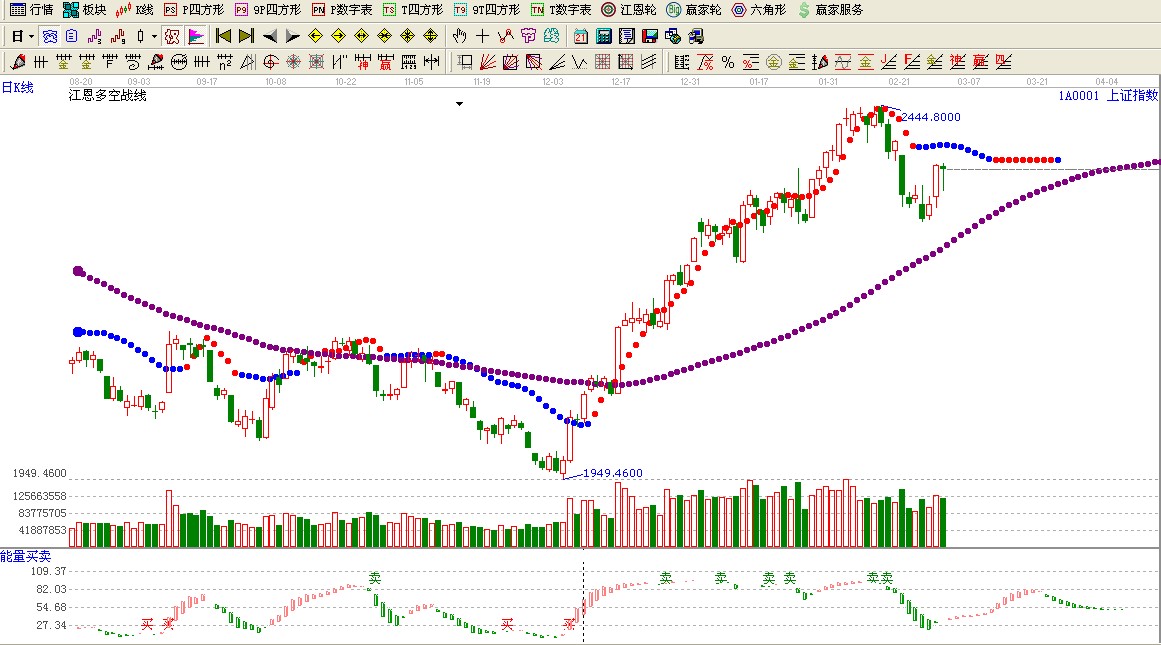 ★依據贏家江恩多空戰線提示:目前大盤運行在長期紫色多空線上方,短期藍色線上方,謹慎做多。