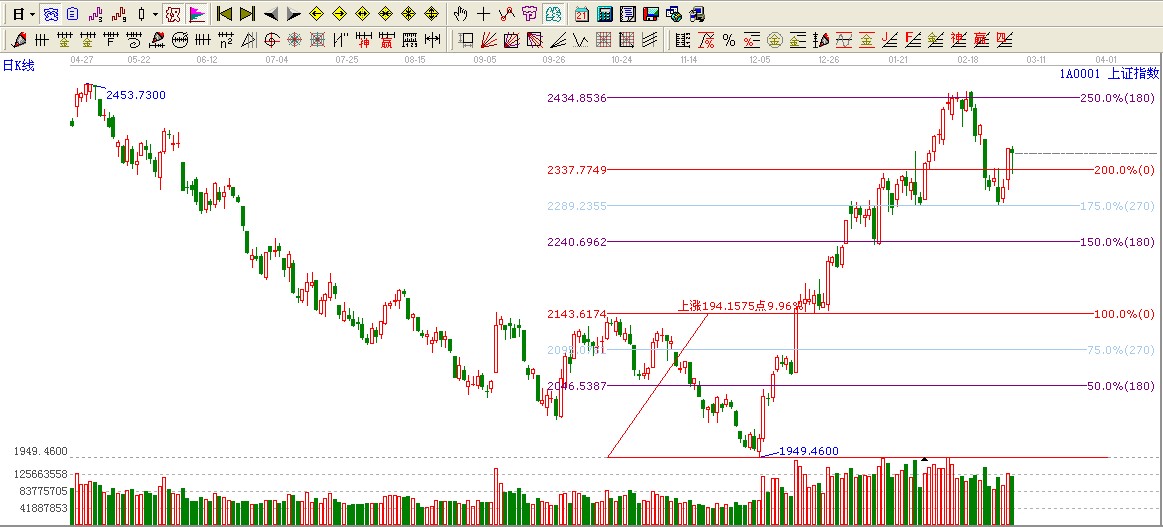 ★依據贏家波段百分比延伸線提示:目前大盤處于波段百分比延伸線200%(0)度位置2337點此位置不破看高至250%(180)度位置2434點附近。