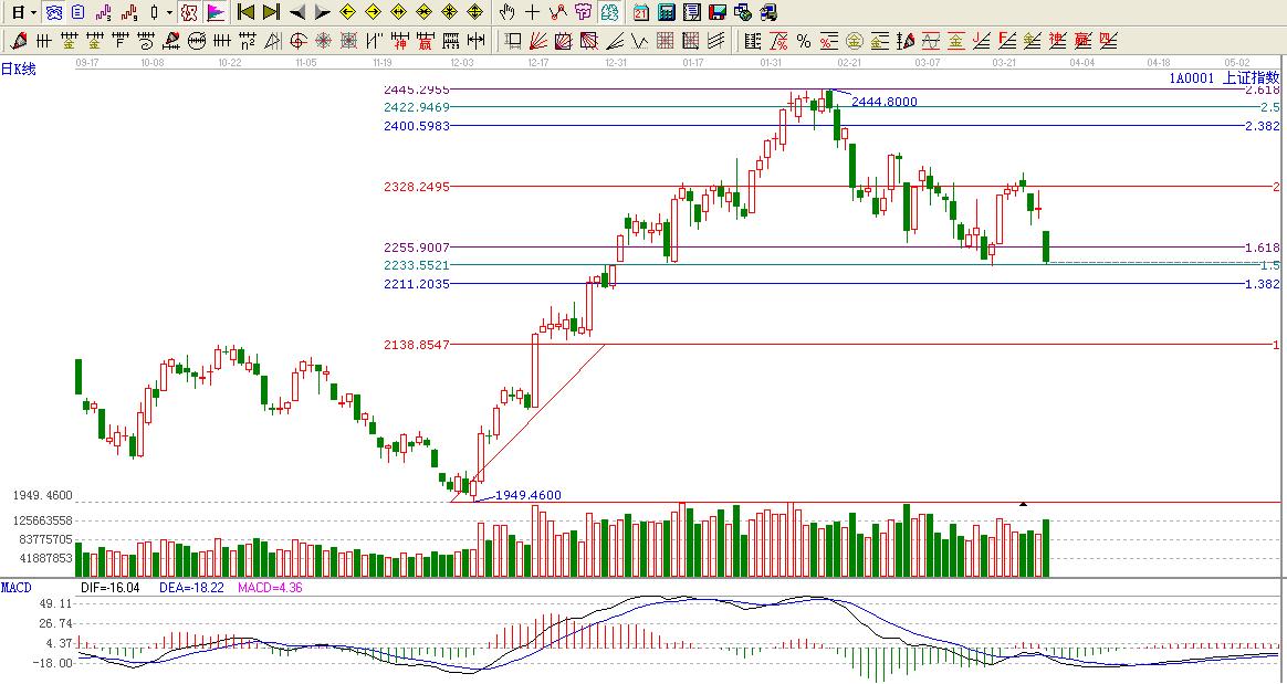 ★依據贏黃金價格延伸線提示:大盤再度考驗黃金分割延伸1.5位置2230附近支撐,一旦破位持續看空至黃金分割延伸線1.382位置2210附近。只有上行在1.618位置才會見2328點附近。