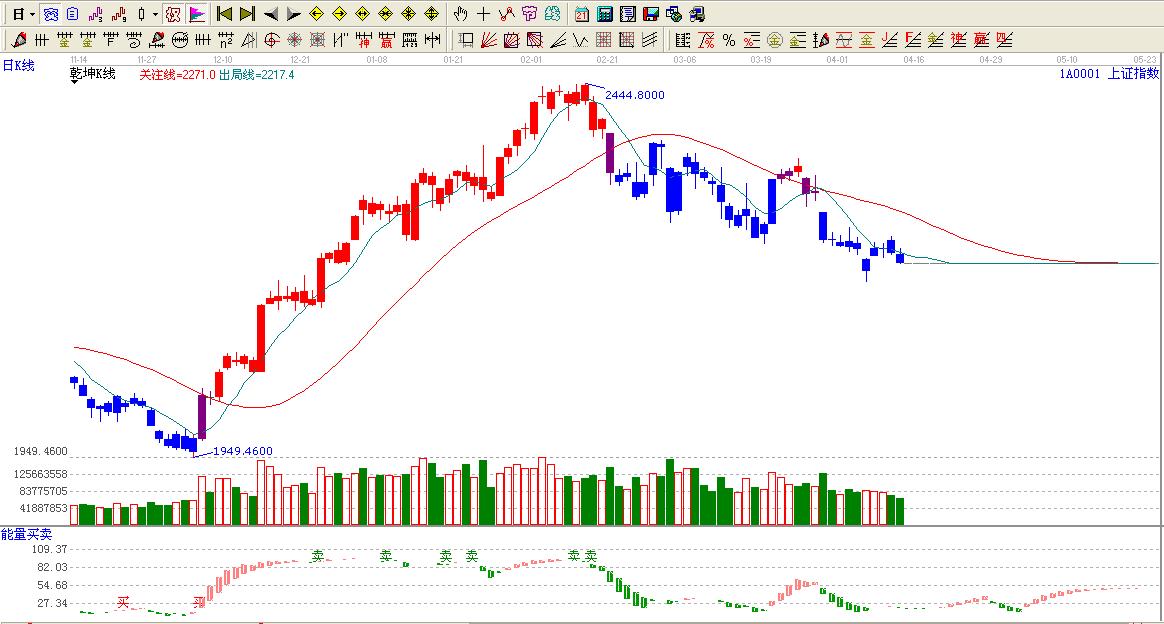 ☆依據(jù)贏家乾坤k線提示:大盤處于藍(lán)色區(qū)域內(nèi),看空。