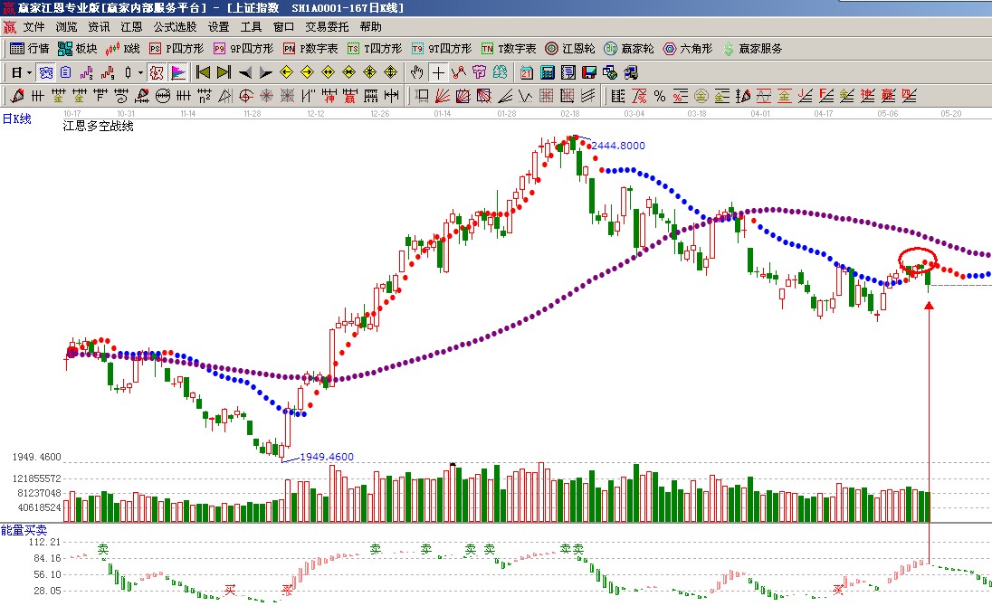 ★依據贏家江恩能量買賣提示:紅色柱子有變綠跡象,注意風險謹慎看多,如圖(1);