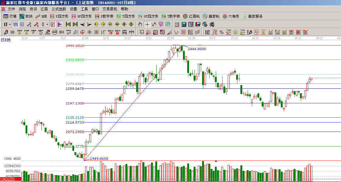 ☆依據(jù)黃金時(shí)間周期線提示:從1949點(diǎn)至2444點(diǎn)做時(shí)間圖(3),5月23號(hào)為時(shí)間窗;