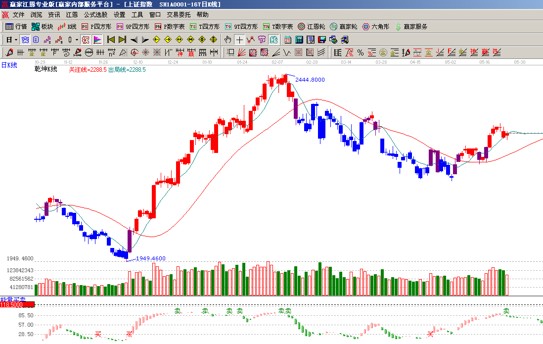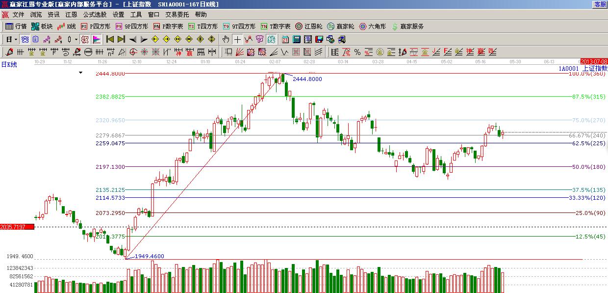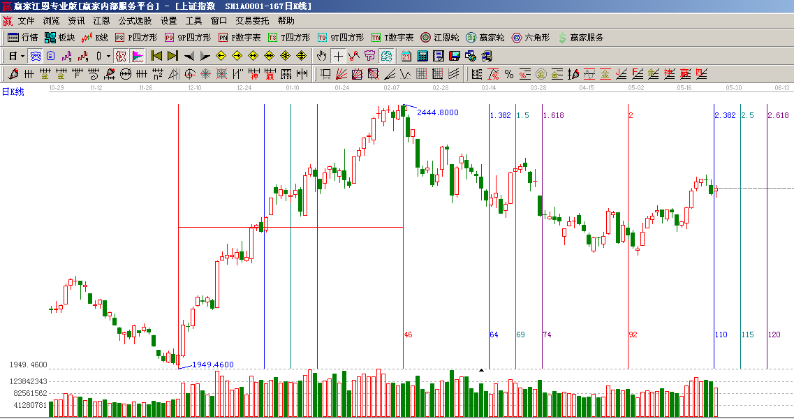 ☆依據(jù)贏家江恩系統(tǒng)黃金時間周期線提示:從1949點至2444點做時間圖(3),5月31號為時間窗;