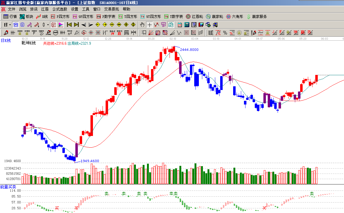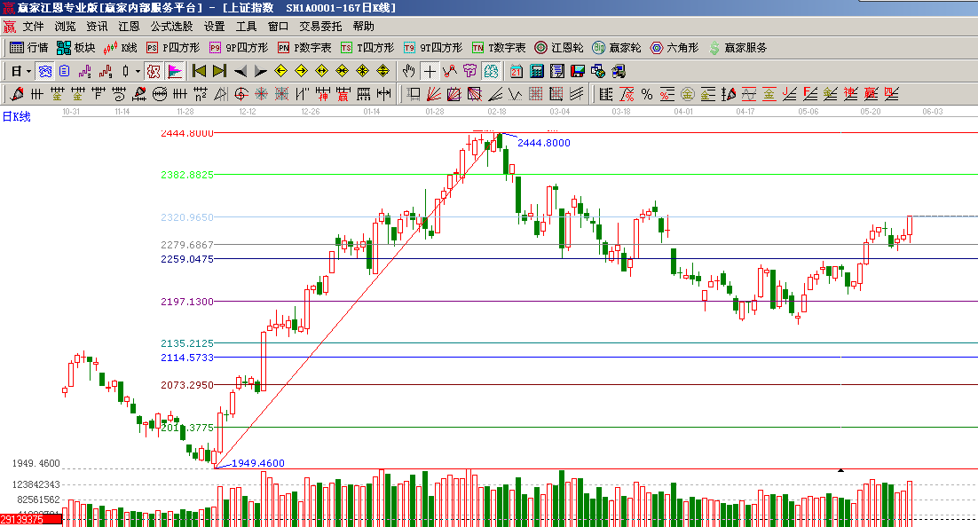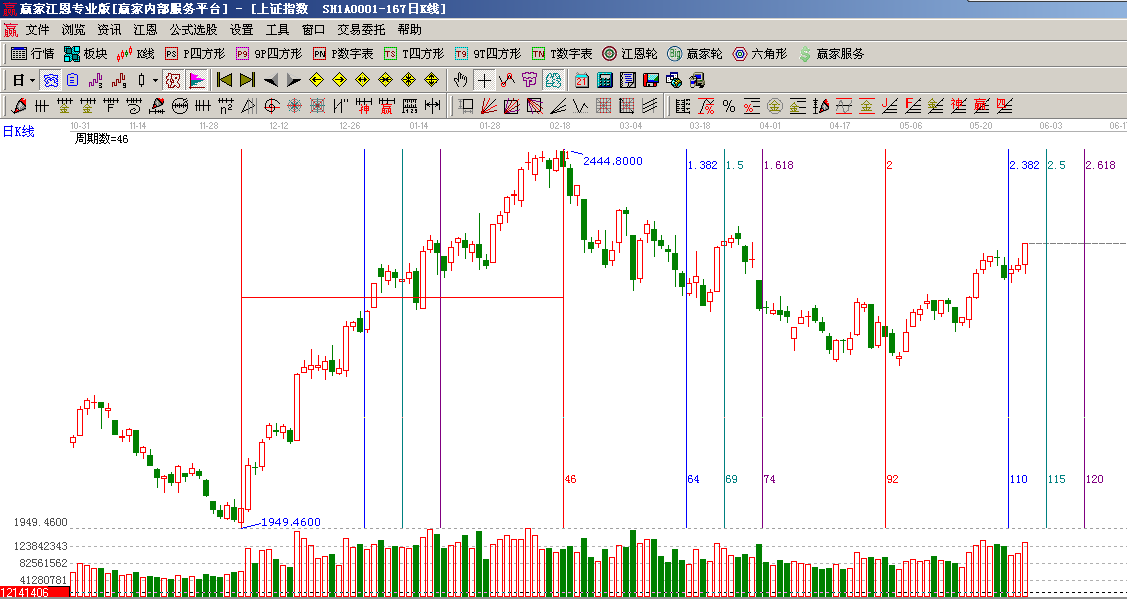 ☆依據贏家江恩系統黃金時間周期線提示:從1949點至2444點做時間圖(3),5月31號為時間窗;