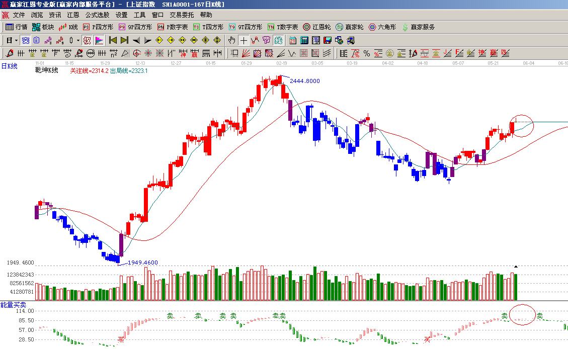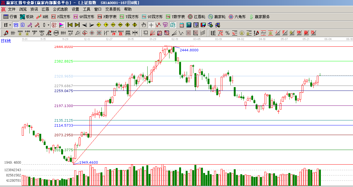 ☆依據贏家江恩系統黃金時間周期線提示:從1949點至2444點做時間圖(3),5月31號為時間窗;